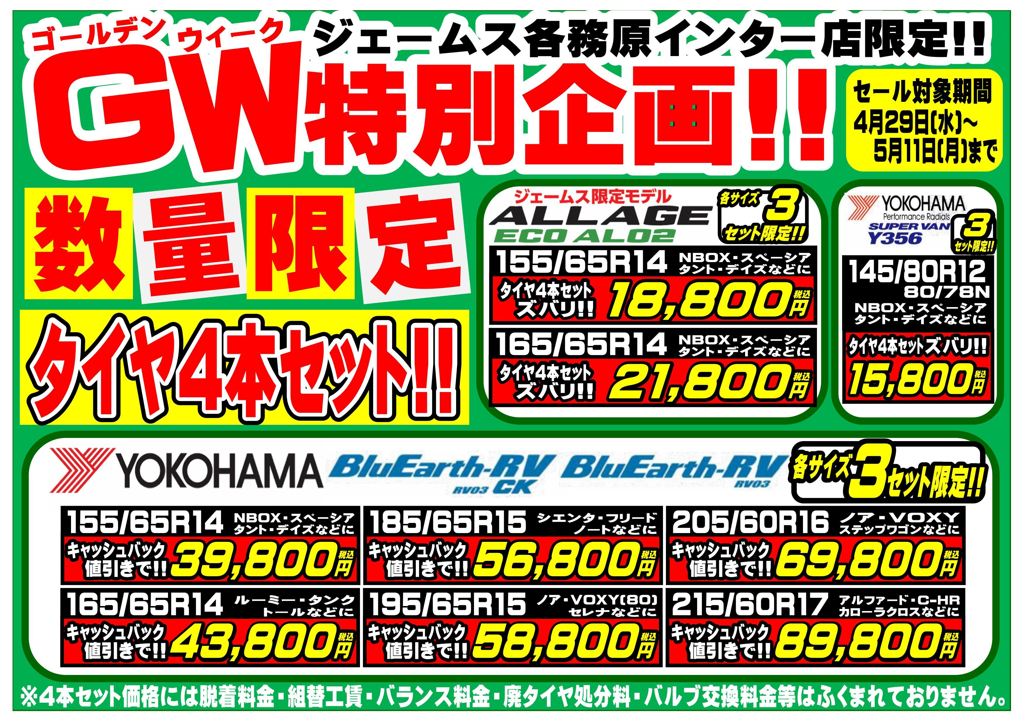 ゴールデンウィーク特別企画としてタイヤ4本セットを数量限定にてご案内!!
