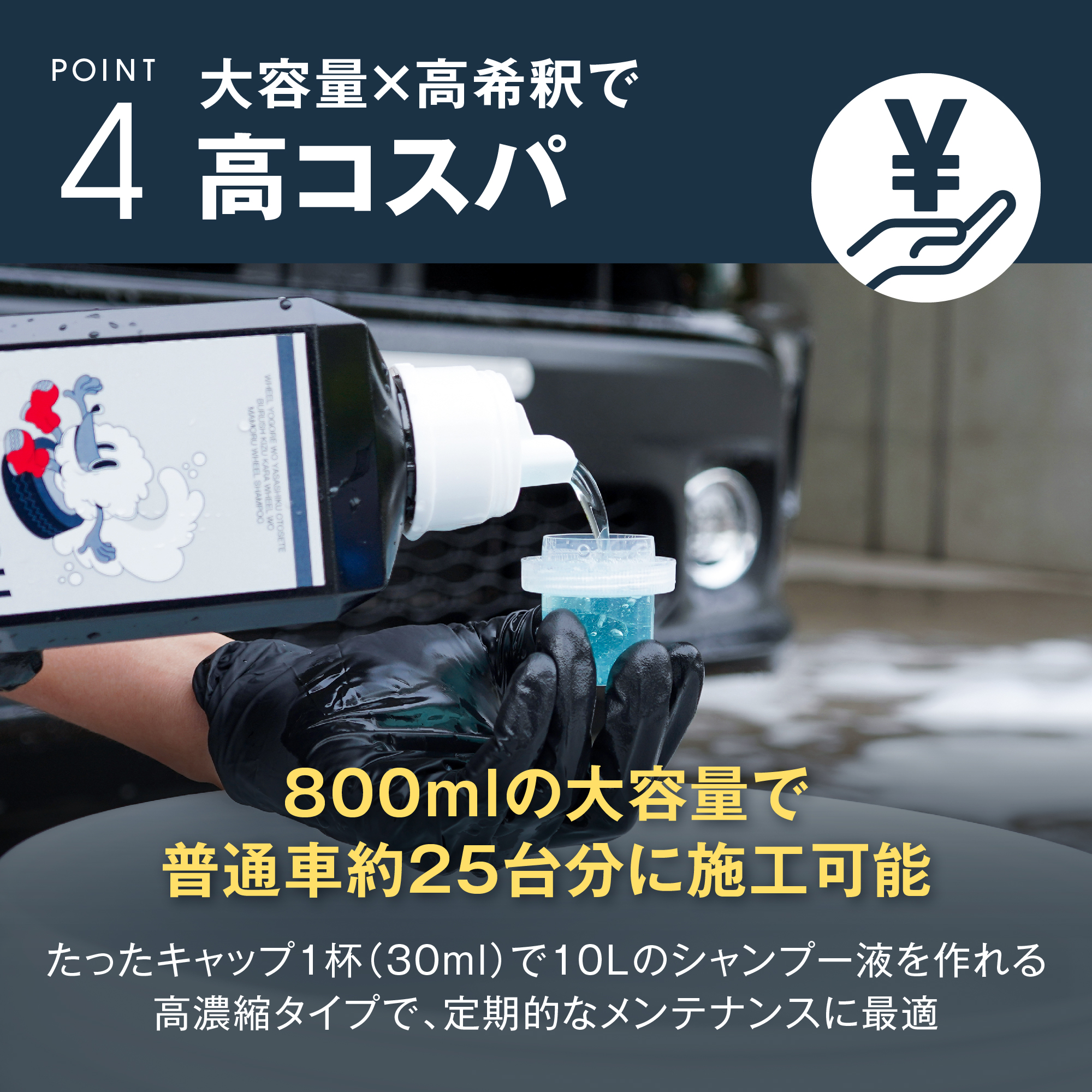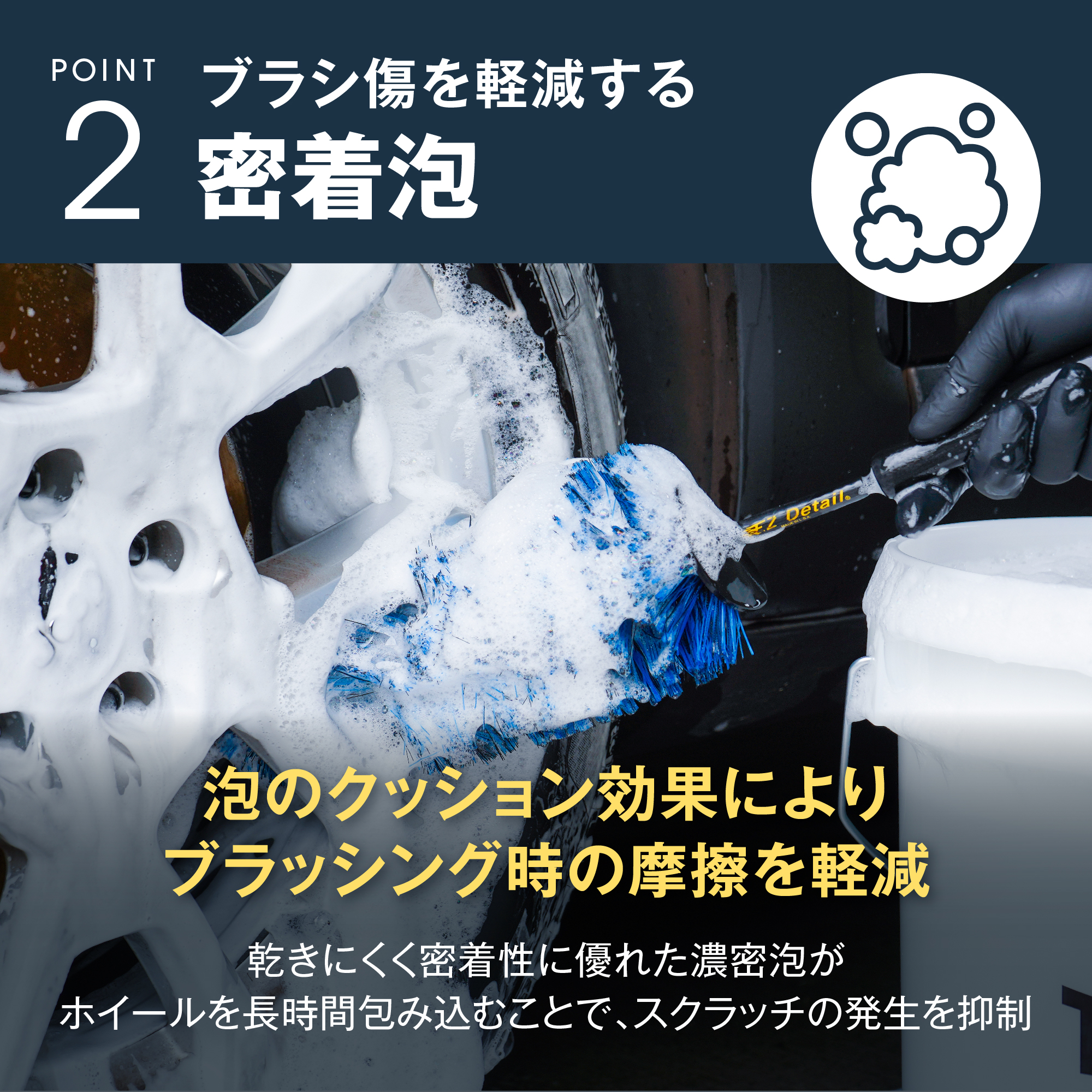 乾きにくく密着性に優れた濃密泡がホイールを長時間包み込むことで、泡のクッション効果によりブラッシング時の摩擦を低減し、スクラッチの発生を抑制します。ノーコンパウンド・中性タイプで、シミやキズによる素材への影響にも配慮した安心処方です。