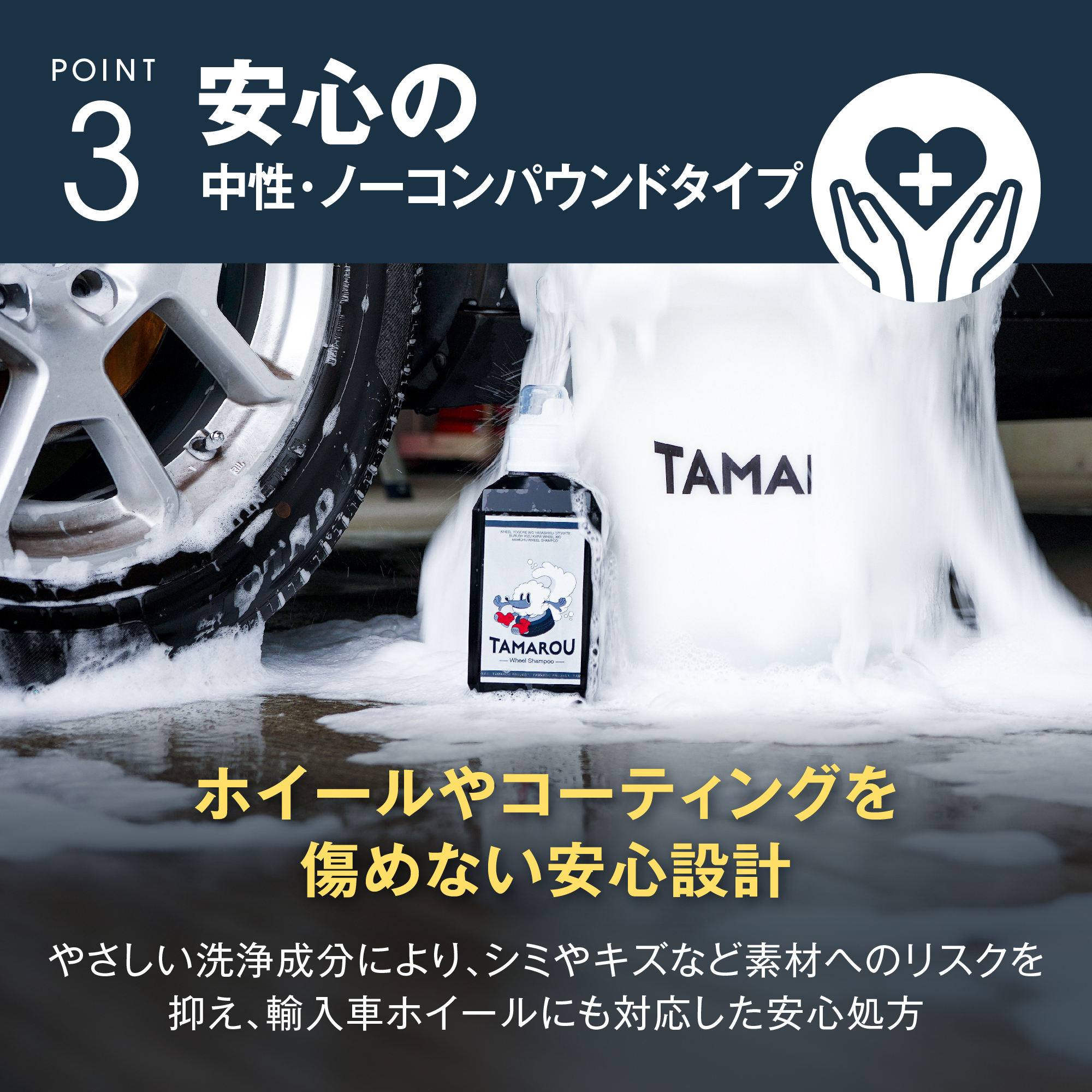 ホイール汚れを優しく落とすホイール専用設計のシャンプーです。乾きにくく密着性の高い濃密泡を実現し、豊富な泡立ちでホイールを長時間包み込み、ブラシ傷の発生を抑えます。ノーコンパウンド・中性タイプでホイールに優しく、輸入車ホイールにも対応しています。頑固なブレーキダスト汚れには、より強力なTAMAROU「Wheel Cleaner」との併用がおすすめです。
