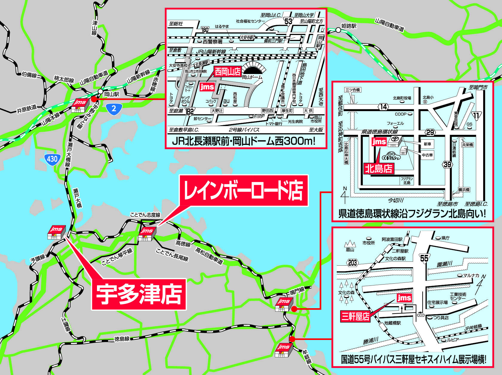 お客様各位 平素は格別のお引き立てを賜り誠にありがとうございます。 この度、12月28日(日)をもちまして、諸般の事情により ジェームスレインボーロード店と宇多津店を閉店いたしました。 開店以来、多くの会員様、近隣の皆様方に ご愛顧頂きました事を心より御礼申し上げます。 なお、今後のジェームスのご利用に関しましては、 以下の近隣店舗にてお客様のカーライフを 精一杯サポートさせていただきますので、宜しくお願いいたします。 近隣店舗:ジェームス西岡山店・ジェームス北島店・ジェームス三軒屋店を引き続きご利用ください。 ジェームスレインボーロード店・宇多津店 店長 従業員一同
