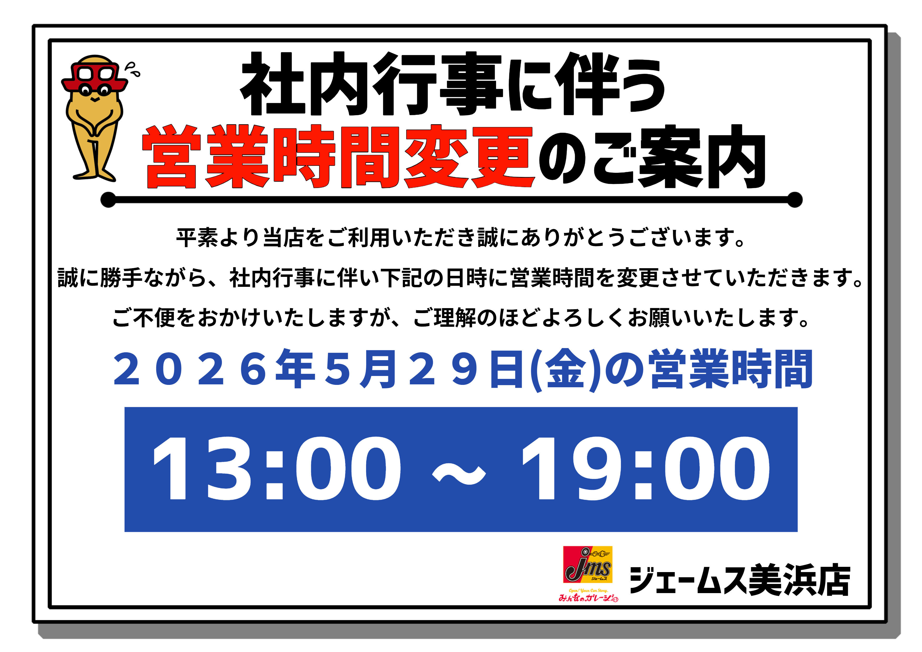 社内行事に伴う営業時間変更のご案内
