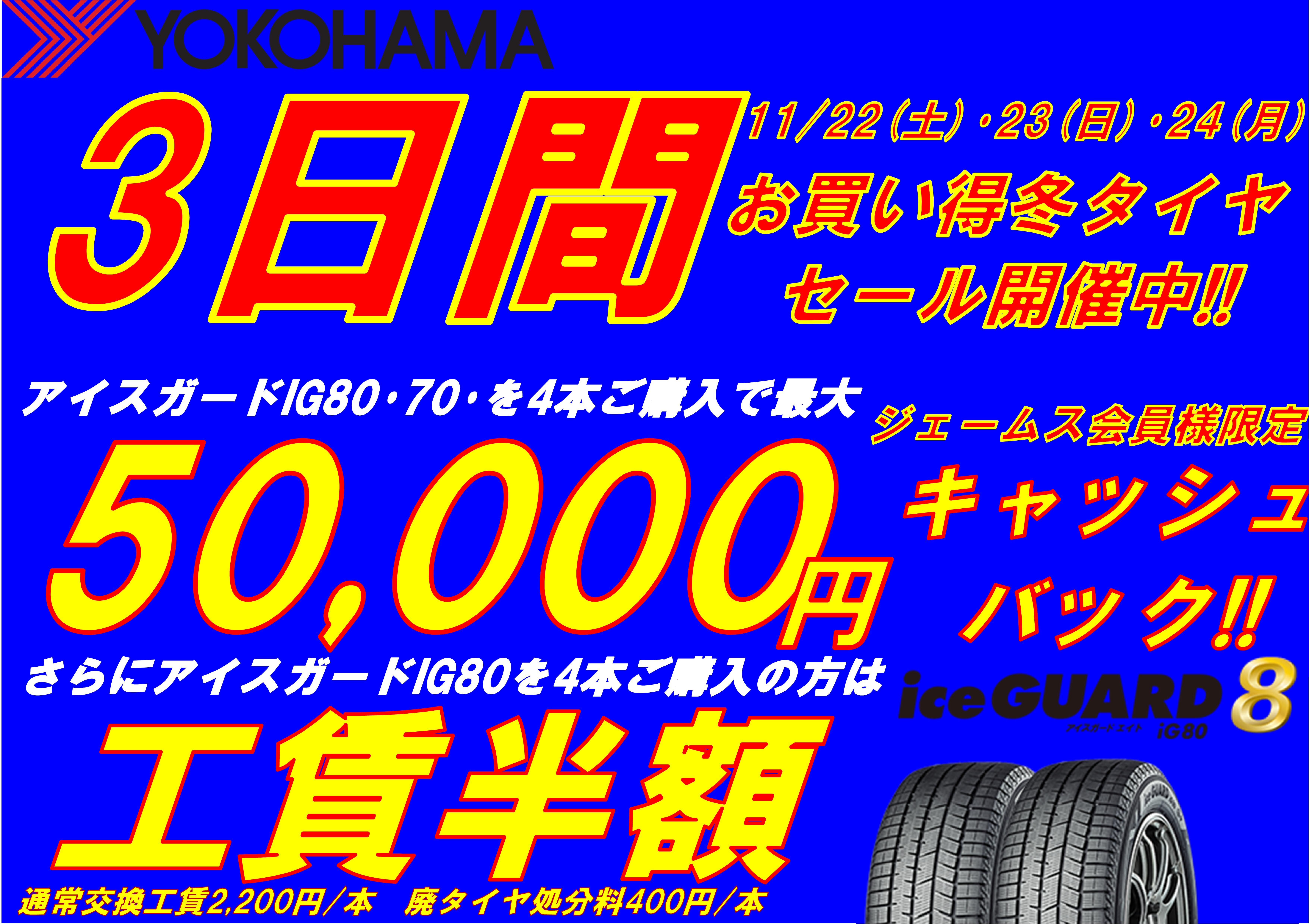 指定ヨコハマタイヤ4本ご購入で最大5万円キャッシュバック開催中!さらに今季新商品のアイスガードIG80の場合は交換工賃半額です♪ご来店お待ちしております!